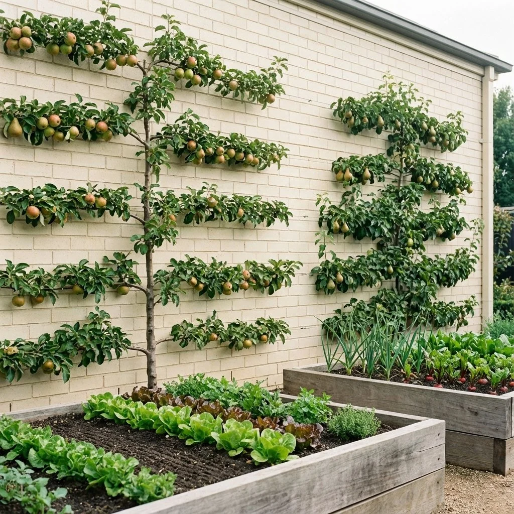 Espaliered fruit trees and discreet vegetable beds turn a boundary wall into a productive, ordered edge.