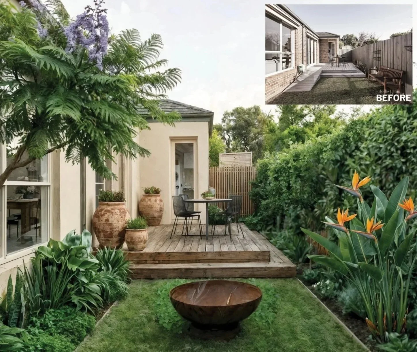 The garden reads as a calm and organised outdoor space centred around the deck and open garden beyond. The breakout area can be lawn or gravel, allowing flexibility depending on maintenance and use. Planting is intentionally restrained, creating a sense of clarity rather than clutter. The front garden is simplified with feature trees that hint at the garden beyond. Over time the space can evolve as new plants, objects, and memories from travel are added.