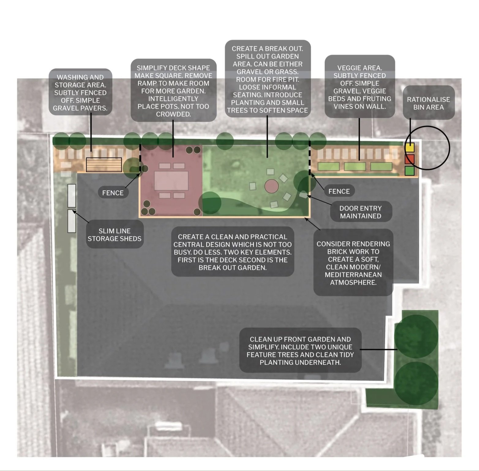 The design begins by simplifying the garden into a clear and practical structure. The space is organised around two key elements: the deck and the breakout garden beyond it. The deck is subtly refined to improve its shape and usability, opening more space for seating and planting. Beyond this sits a flexible open garden area for informal gatherings, loose seating, or a fire pit. Two side wings discreetly contain practical uses such as vegetable growing, washing, and storage.