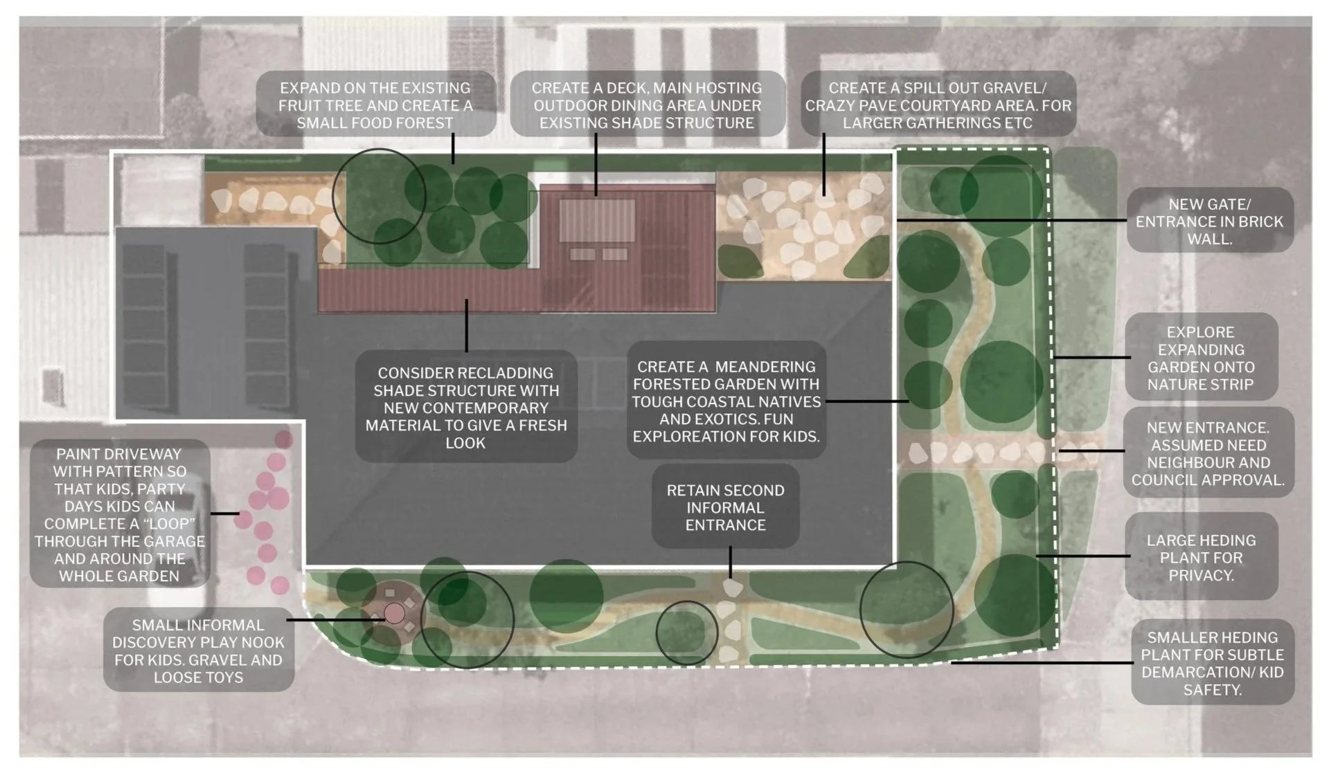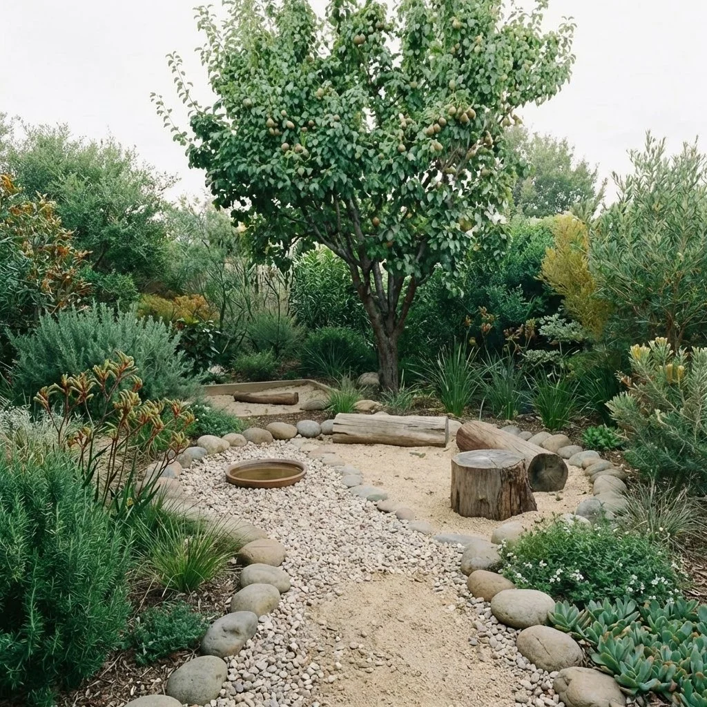 The design organises the garden into two clear zones. The eastern courtyard becomes the primary outdoor living space, structured with durable surfaces and a timber deck beneath an upgraded shade structure. Productive planting expands into a compact food forest on one side while a flexible gravel courtyard supports gatherings and play on the other. Beyond this, the rest of the site becomes a surrounding natural garden with resilient coastal planting.